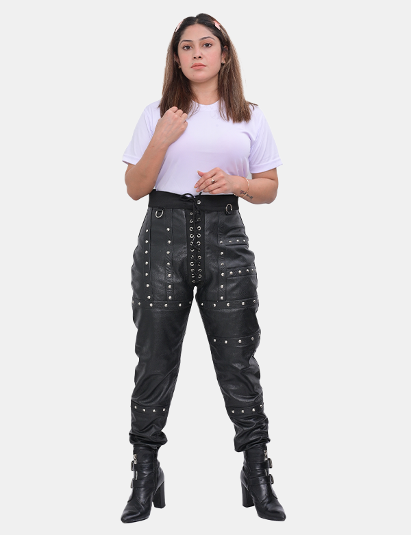 Women's Studded Black Leather Pants - Edgy Gothic Punk Rock Biker Style, Rebellious Night-Out Pants with Attitude and Studs Women's Studded Black Leather Pants - Edgy...
