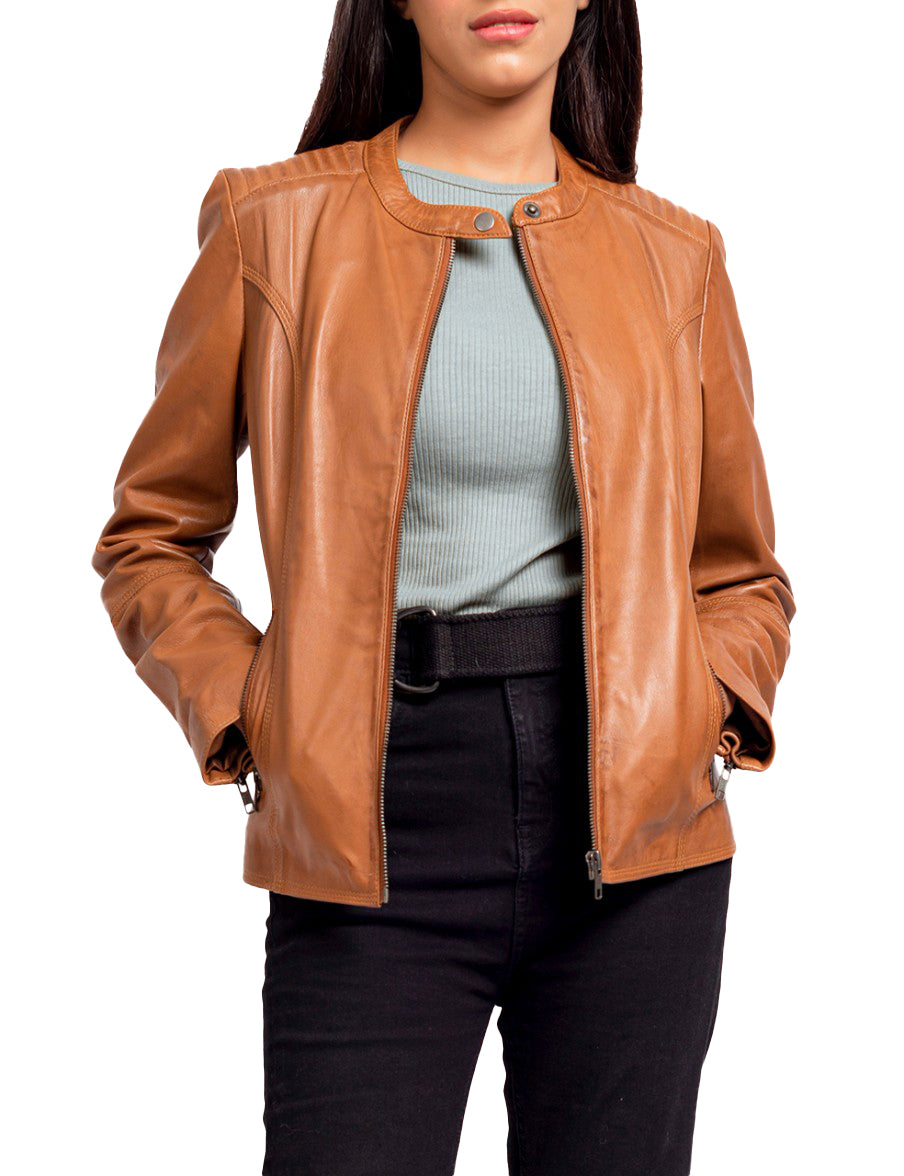 Women’s tan leather jacket – classic biker moto style